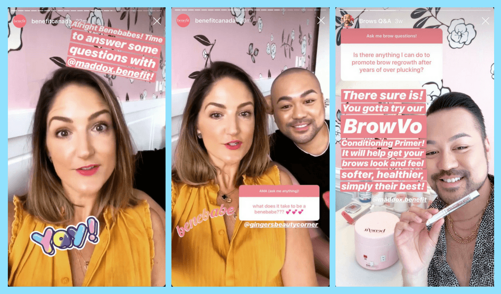 For example, Benefit Cosmetics started an Ask Me Anything (AMA) session on their Instagram page with their team. When a user asked a question on promoting eyebrow growth, their team organically promoted their BROWVO Conditioning Primer.