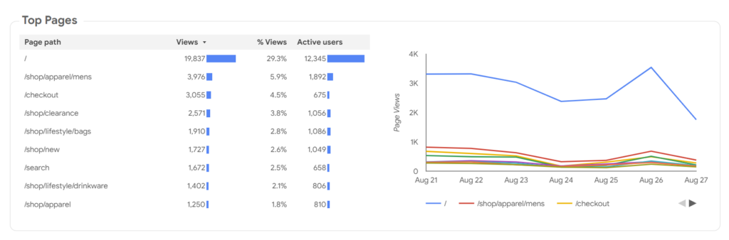 - Ecommerce conversion report: Total revenue, conversion rate, average order value, revenue per user, top pages